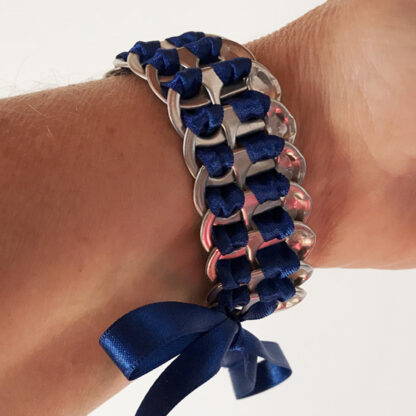 Ces bracelets sont entièrement fait main avec des rubans et des capsules de canettes aluminium bien nettoyées. La fermeture par nœud avec le ruban permet un réglage en fonction de la taille du poignet, néanmoins ce produit est disponible en 2 longueurs. Peut être réalisé à la commande, n’hésitez pas à me contacter pour une variation de couleur. Léger et écolo, voici un petit cadeau à petit prix.