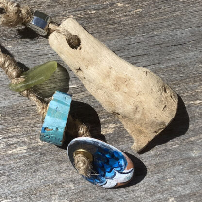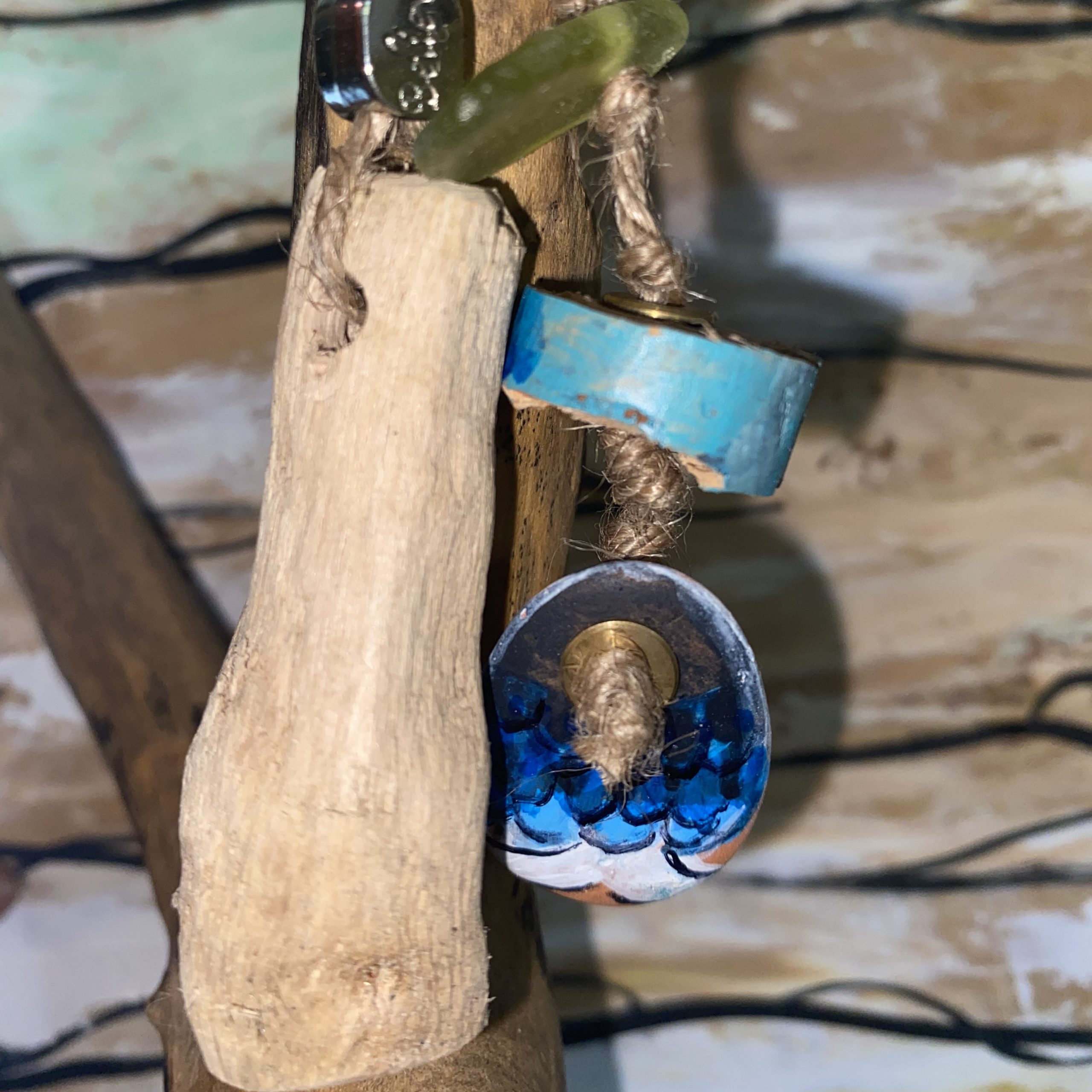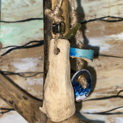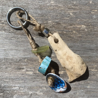 Porte-clefs fait main avec fruits de plages de Provence et d’ailleurs. Bois flotté , perle Believe et bouts de verre et tuile polis par la mer montés sur anneau. Exemplaire unique.